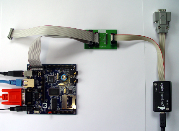 Wir nutzen den Turtelizer 2. Leider entspricht sein JTAG Stecker nicht dem gängigen und beim EIR verwendeten 20-poligen Standard, sondern dem 10-poligen AVR Layout. Ein spezieller Adapter ist erforderlich um ihn mit der 20-pin Stecker des EIR Boards zu verbinden.