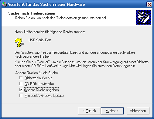 Verbinden sie ein Ende des USB Kabels mit dem PC und das andere mit dem JTAG Adapter. Windows wird die neue Hardware automatisch erkennen. Gleichzeitig erscheint die erste Seite des Assistenten für Neue Hardware gefunden. Folgen sie den Anweisungen. Stellen sie sicher das die Option Einen Ort auswählen als einzige ausgewählt ist.