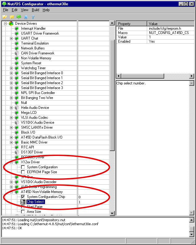 - Set Chip Select in Device Drivers->AT45D Non-Volatile Memory to 1.